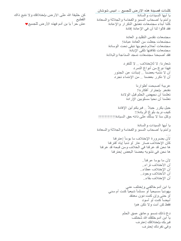 كلمات قصيدة هذه الارض للجميع