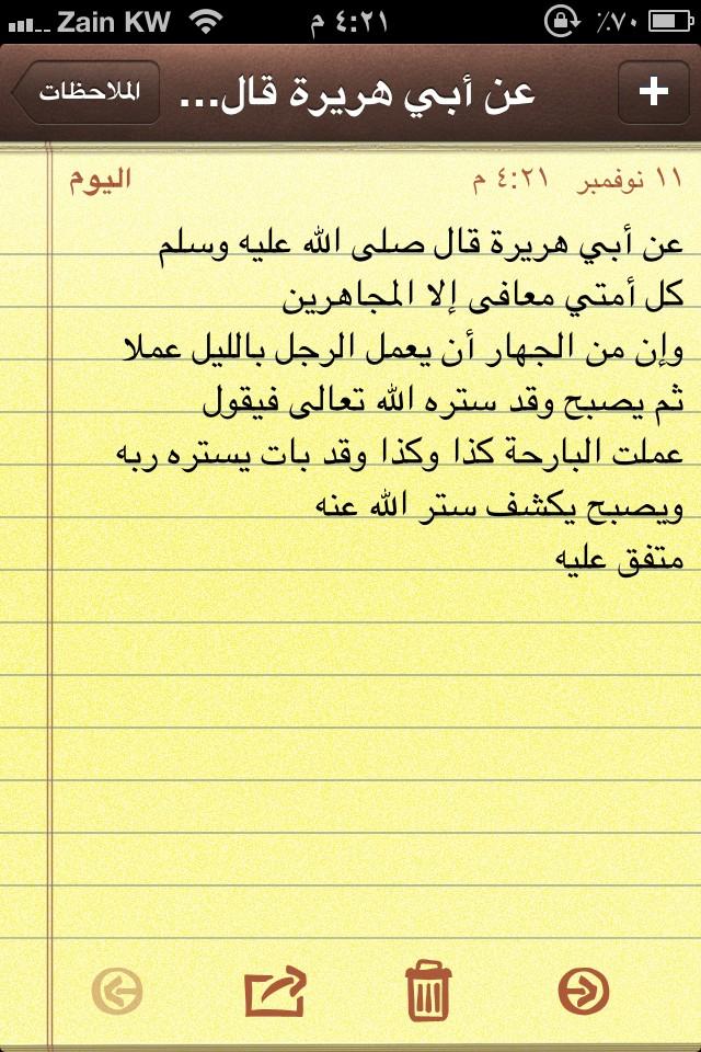 عن أبي هريرة عن الرسول صلى الله عليه وسلم قال كل أم تي م عاف ى إل ا الم جاه رين وإن من الم جاهرة أن يعم ل Beautiful Islamic Quotes Ahadith Hadith